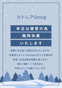 本日、雪の影響により道路状況の悪化や予測できない事態が起こる可能性があるため、スタッフとお客様の安全を最優先に考え、臨時休業とさせていただきます。本日ご予約をいただいていたお客様には、多大なご迷惑をおかけし誠に申し訳ございません。